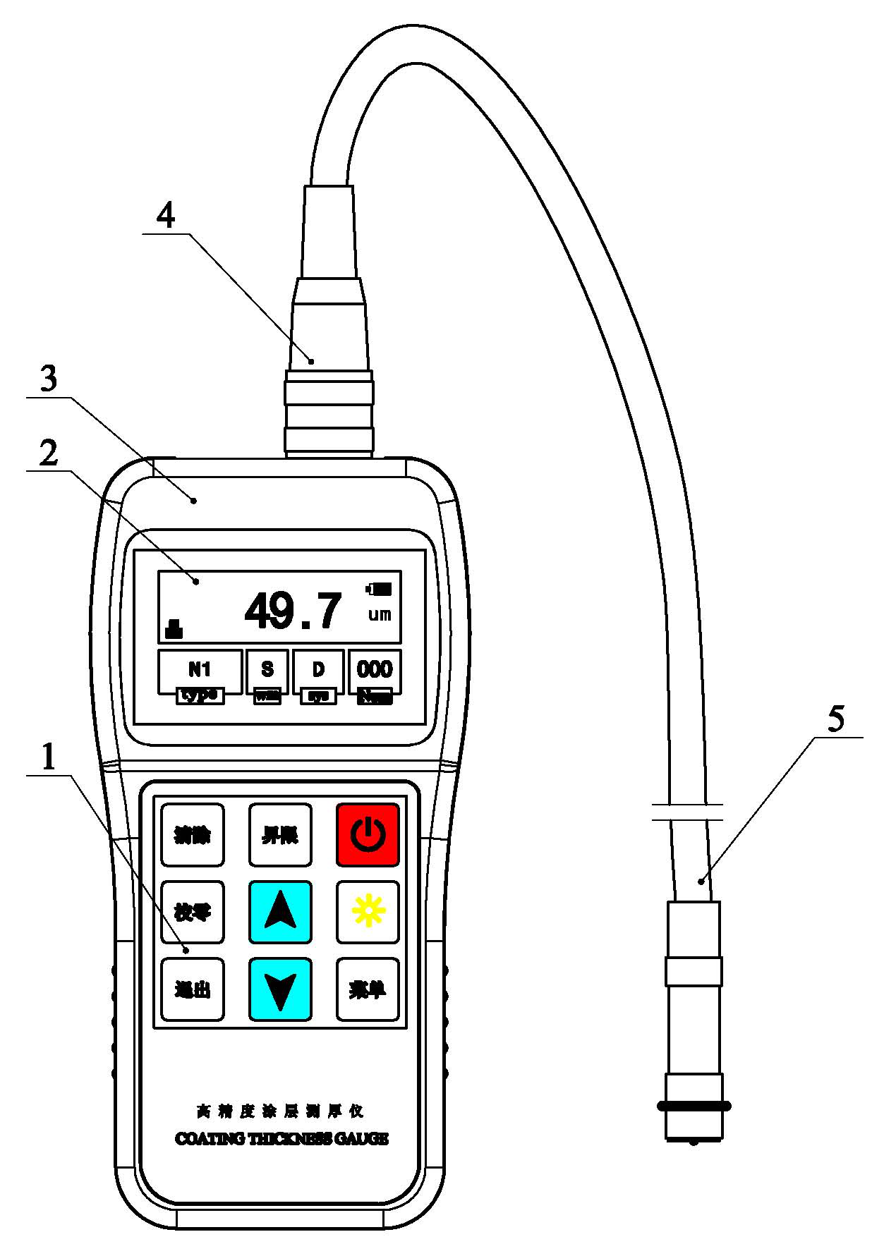1.仪器主机 2.显示屏 3. 键盘 4. 测头插座 5. 仪器测头
